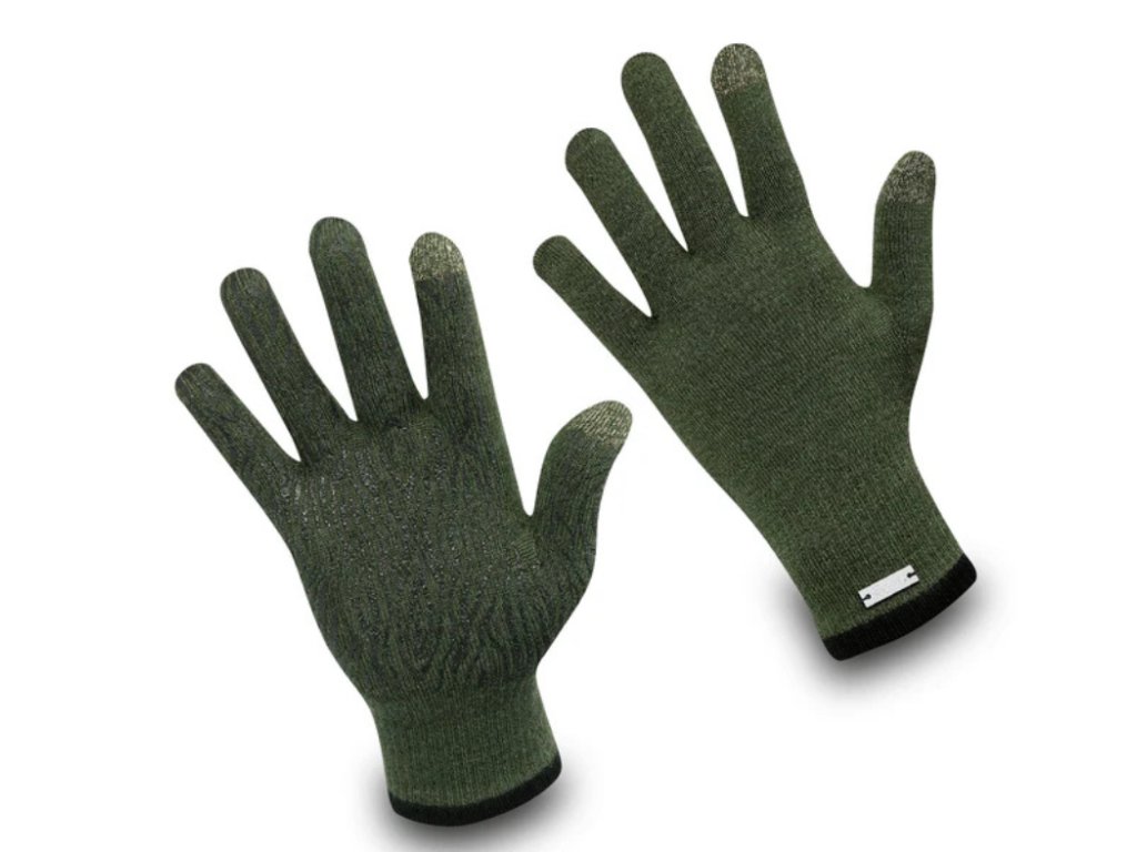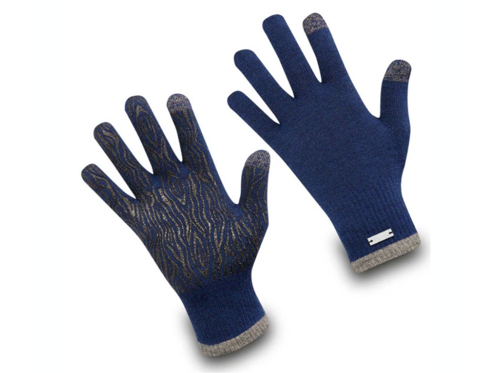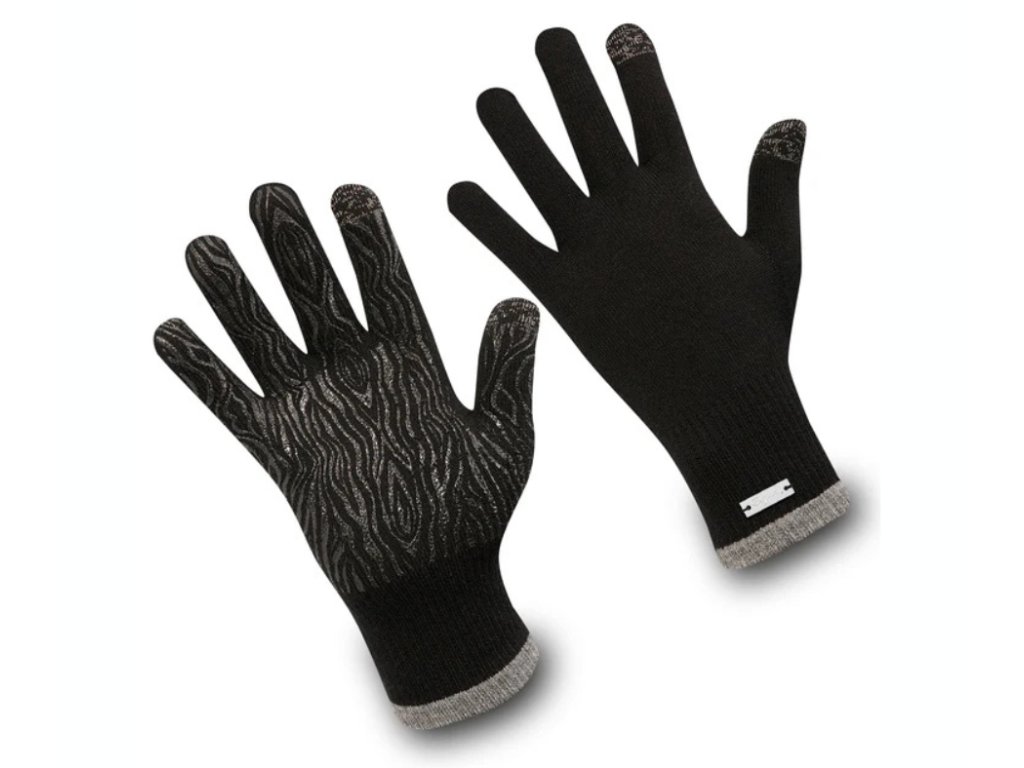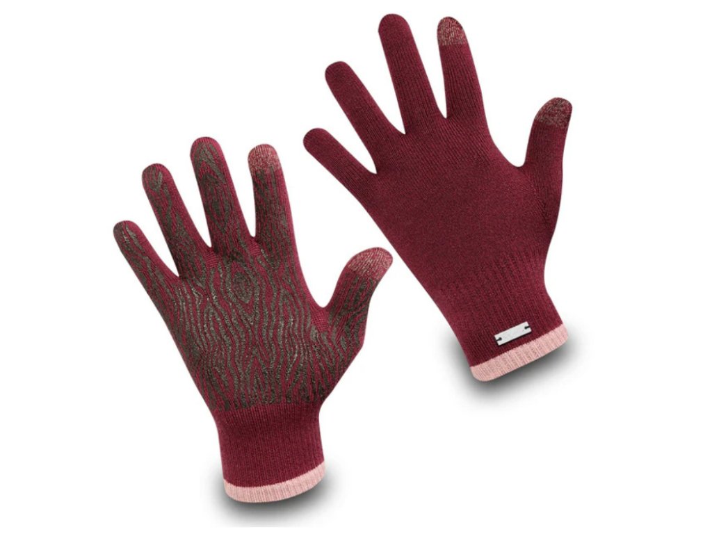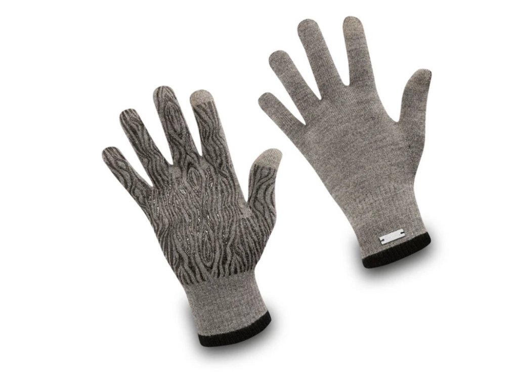 Elastic knitted gloves made from Merino wool, with anti-slip grip and touchscreen capability, produced in the Czech Republic, packaged in a gift box.
