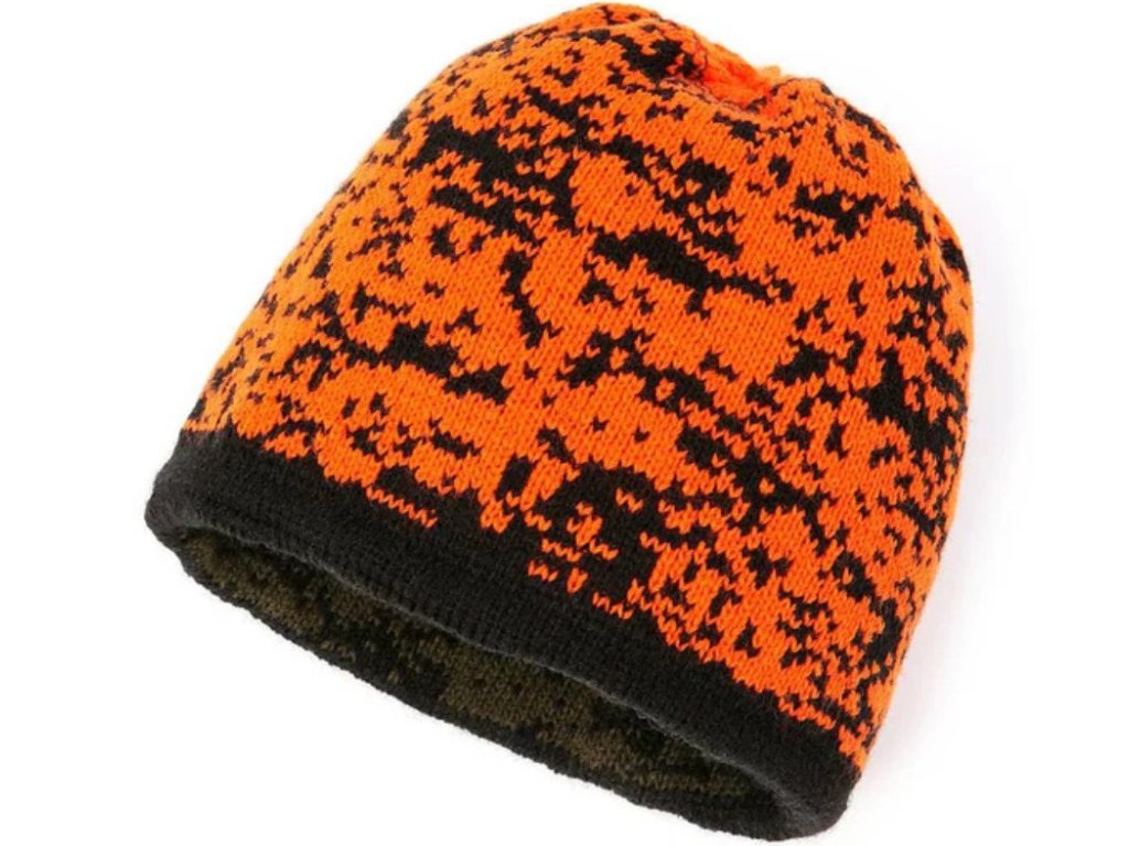 Reversible winter hunting hat made from acrylic, featuring a camouflage pattern on one side and a high-visibility signal pattern on the other, knitted in the Czech Republic.